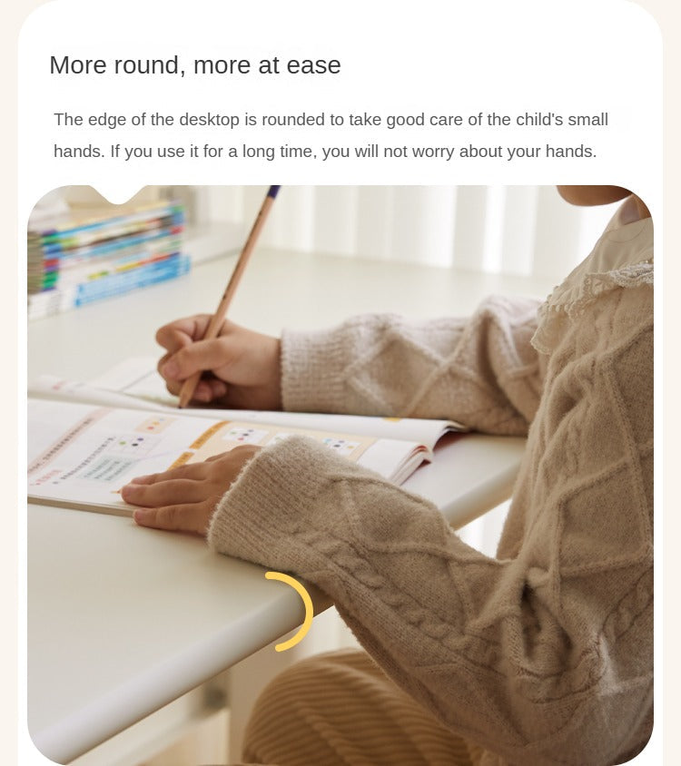 Child safety is at the forefront of this desk’s design, featuring rounded corners to prevent bumps and injuries and a thickened desktop for improved load-bearing capacity. Integrated cable management keeps the workspace neat and clutter-free, promoting focus and productivity during study sessions.