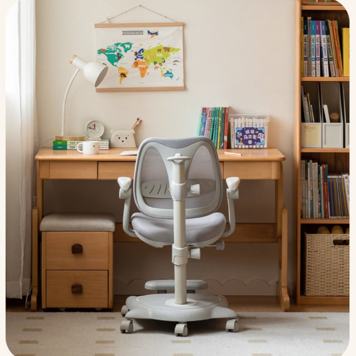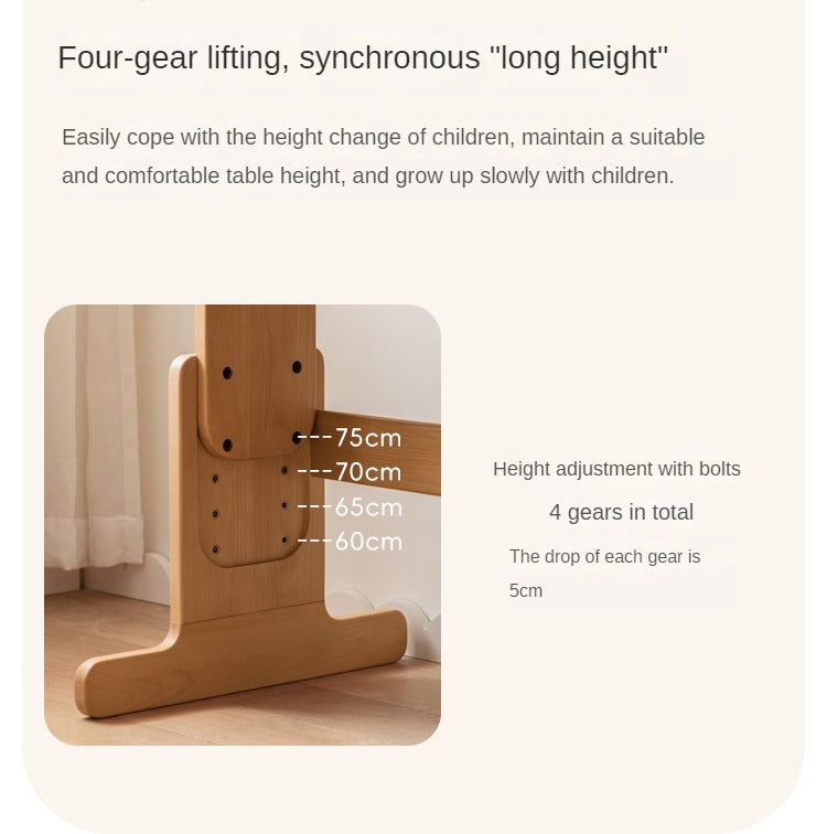 Enhance any study space with the Beech Solid Wood Adjustable Height Desk & Bookshelf Set—a thoughtfully designed study table pairing natural elegance with smart functionality. Made from premium European beech, this desk displays a refined, warm wood grain and uniform texture that brings both beauty and durability to your home. Its natural, light-toned finish effortlessly complements a wide range of room styles, ensuring it remains a timeless part of your child's growing years.