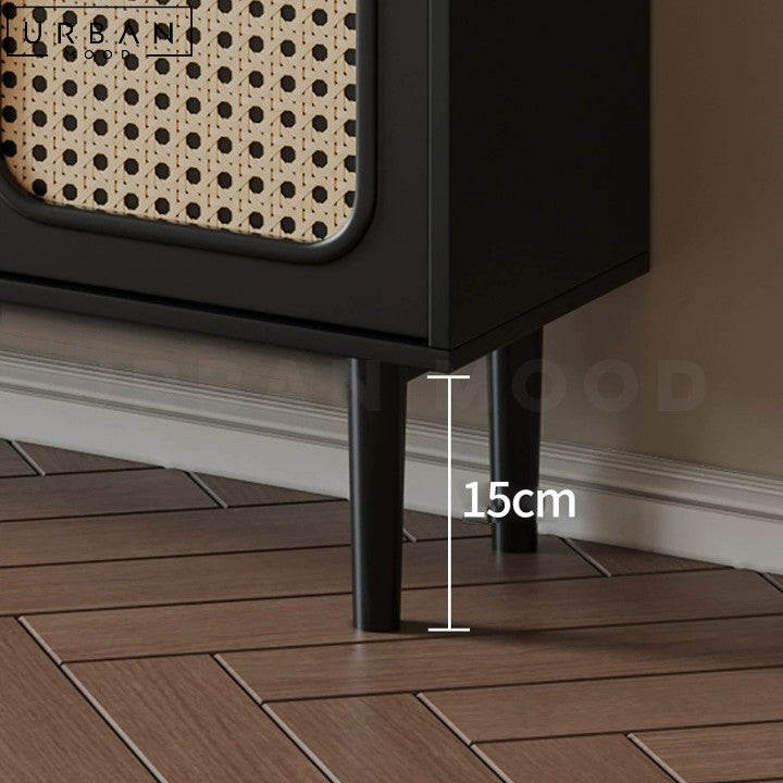 Introducing the JOSELYN Vintage Rattan Sideboard, a versatile piece that exudes nostalgic charm combined with practical functionality. This stunning buffet features retro-inspired rattan cladded doors highlighted by sleek gold hardware, providing a beautiful contrast to its cool black finish. Perfect for organizing your belongings, the JOSELYN Sideboard offers ample storage space, making it an ideal addition to your living room, bedroom, or office. Crafted from multilayer board and synthetic rattan, and supported by electroplated steel, this sideboard seamlessly blends into modern, noir, or vintage-inspired interiors, adding both style and convenience to your space.