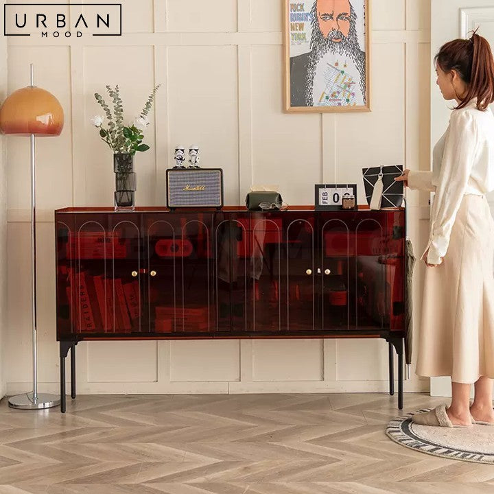 Crafted from highly resilient acrylic, the FONA Modern Sideboard promises both style and functionality. This sleek cabinet stands on sleek metal legs, offering a sturdy and elegant design that enhances any modern or art deco home decor. Its ample storage space is perfect for organizing essentials and showcasing your favorite decorative items. The combination of its acrylic body and powder-coated steel frame ensures durability while adding a contemporary touch to your living space. Elevate your home's aesthetic with the versatile and charming FONA sideboard.