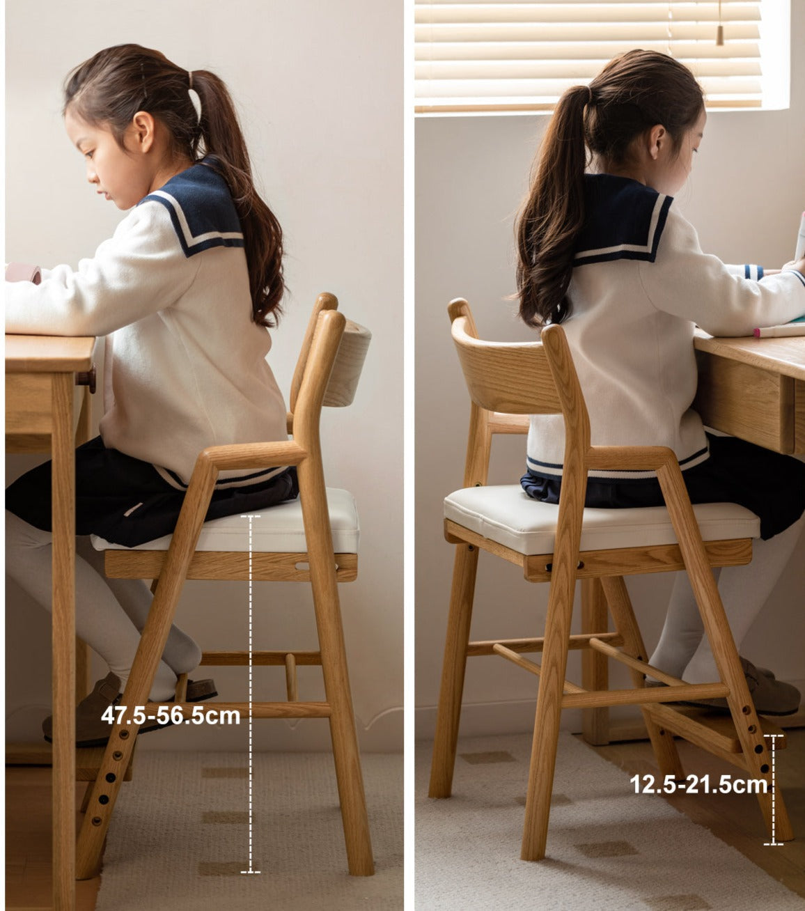 This chair is thoughtfully designed to adapt to your child's growth, featuring a height-adjustable seat with four settings between 43.4 cm and 52.4 cm. The adjustable footrest also ranges from 12.3 cm to 24.9 cm, accommodating children as they grow and helping them maintain the correct posture during study or creative activities. A sturdy trapezoidal base provides excellent stability, reducing the risk of tipping and ensuring your child sits safely and securely at all times.