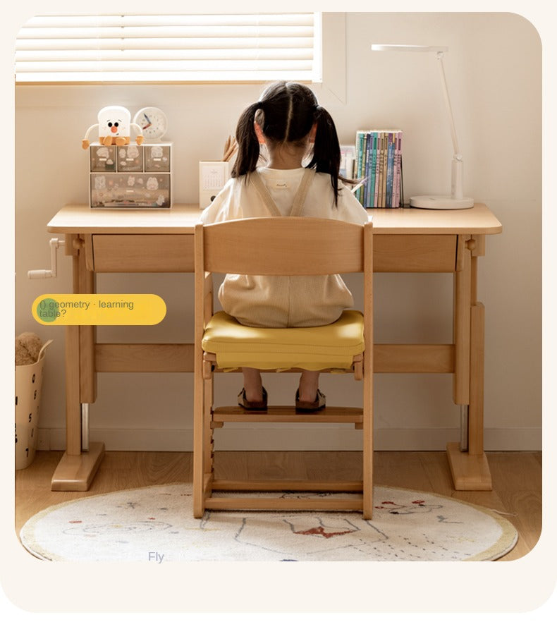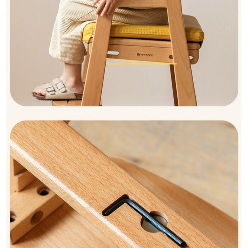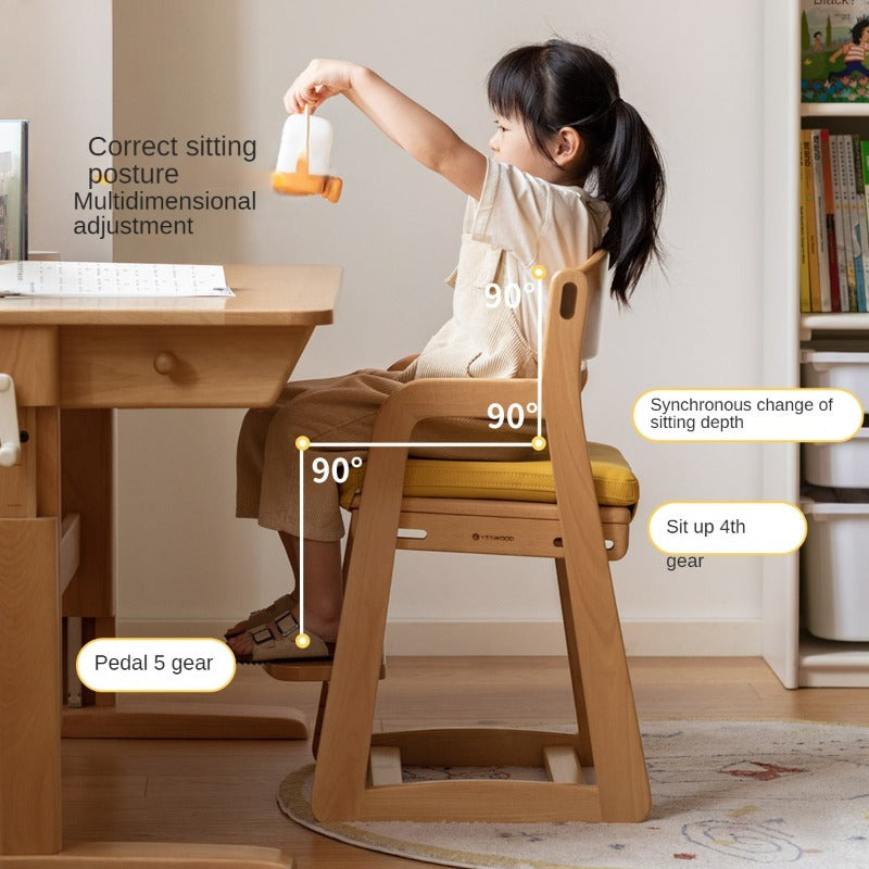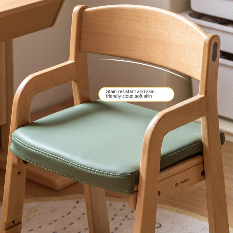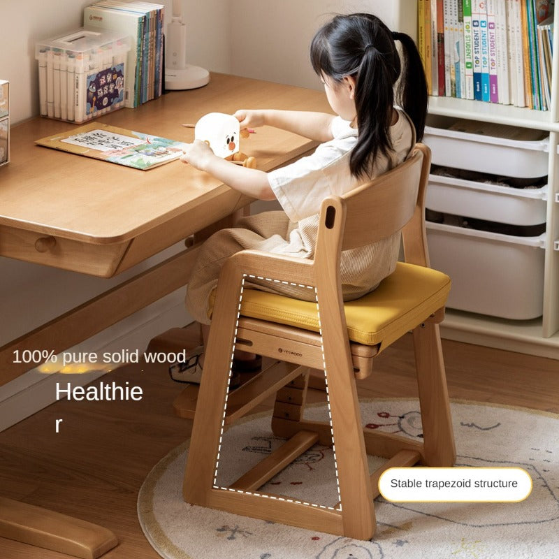 Beech Solid Wood Adjustable Lift Chair for Children Natural Finish Ergonomic Writing and Dining Chair with Cushion