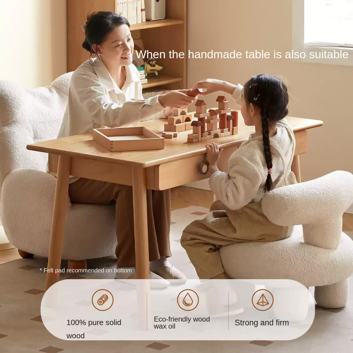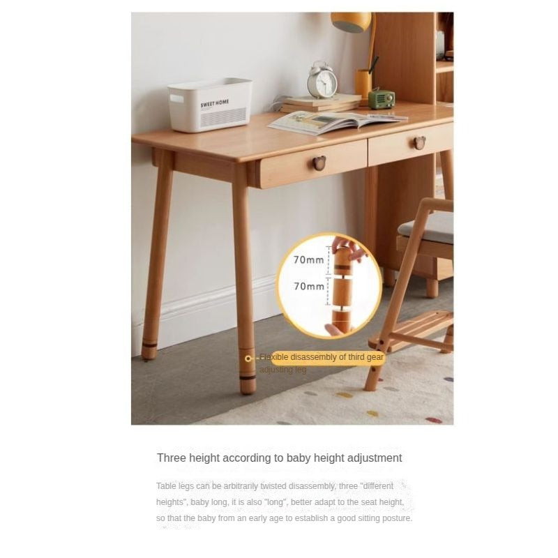 Beech & Oak Solid Wood Children's Study Table Introducing the Beech and Oak Solid Wood Children's Study Table, expertly crafted from 100% pure solid wood, providing an environmentally friendly solution for your child's study needs. This table is finished with a natural wood wax oil coating derived from plant extracts, ensuring it is safe, healthy, and beneficial for both the environment and your family. Versatile Design This table features a large board with a spacious straight tabletop, measuring 56cm in width—perfect for artwork, homework, and creative projects. The design incorporates a 3-speed height adjustment, accommodating different stages of growth and allowing it to adapt to your child's needs as they grow. Flexible Storage Options Includes an upgraded high compartment for efficient vertical storage. Two storage shelves that can be customized, ideal for organizing teaching materials and stationery. Partitioned space designed for classifying storage, promoting good habits in your child. Durable and Safe Construction Constructed from imported European Beech and Oak, the table is designed for longevity and durability. Our use of mortise and tenon joint technology promotes excellent mechanical properties, reducing the risk of stress release over time. The polished edges and rounded corners ensure safety for children, protecting them from bumps and bruises. Child-Centric Features With a legroom height of 63cm and the flexibility to disassemble the table legs for three different heights (61cm, 68cm, and 75cm), this study table ensures your child maintains a proper posture while studying. The spacious design allows for ample freedom of movement, making it easier for them to concentrate on their tasks. Elegant Aesthetics The Beech and Oak table boasts a simple, refreshing design that complements any interior. Its natural wood grain adds warmth and charm to your child's study area, making it visually appealing while serving practical functions. Specifications Materials: Beech, Oak, and Tung Wood for drawer panels, Black Walnut for shelves and handles. Dimensions: Height adjustable from 61cm to 75cm, tabletop size 56cm width. Finish: Eco-friendly wood wax oil for enhanced protection and moisture retention. Storage: Includes practical double pull-out drawers and easy-access shelves. Make studying enjoyable and organized for your child with the Beech and Oak Solid Wood Children's Study Table—where durability meets functionality in a stylish design.