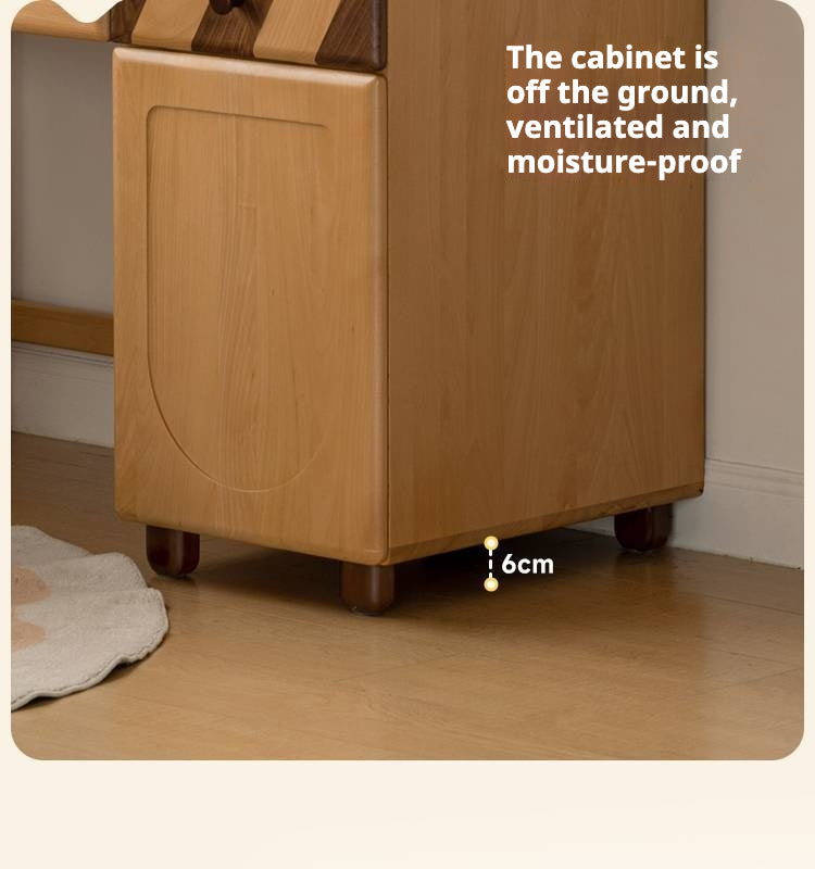 Materials are chosen to maximize longevity and environmental friendliness. In addition to the main beech wood structure, New Zealand pine and paulownia wood are used in key areas to enhance toughness and resist wear. The straight splicing technique minimizes glue usage and emphasizes the stability and natural beauty of the wood grain. The beech walnut accents on the shelf and cabinet legs further highlight the craftsmanship.