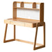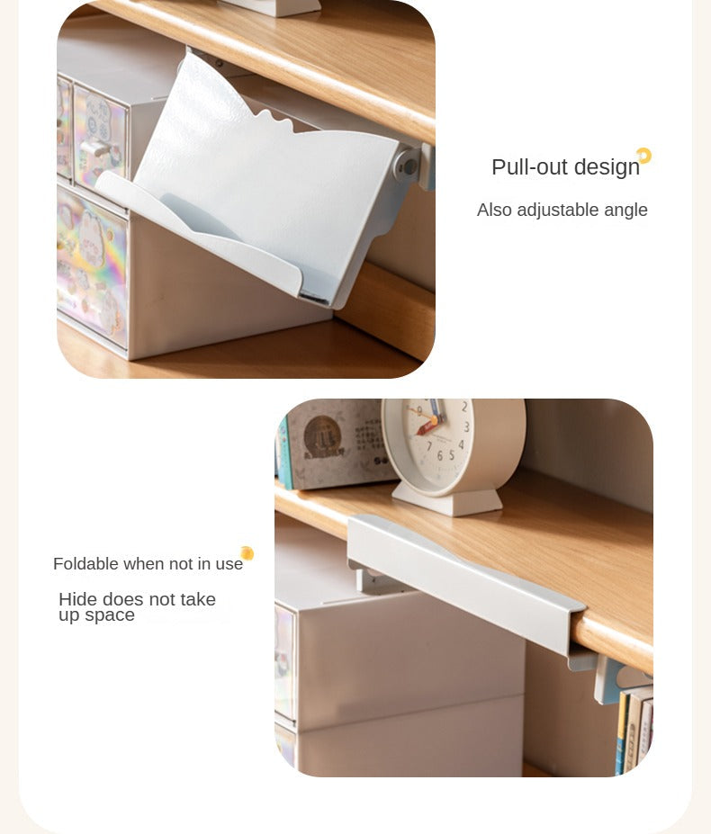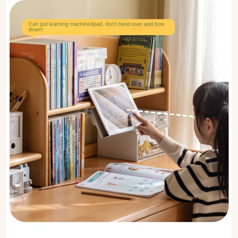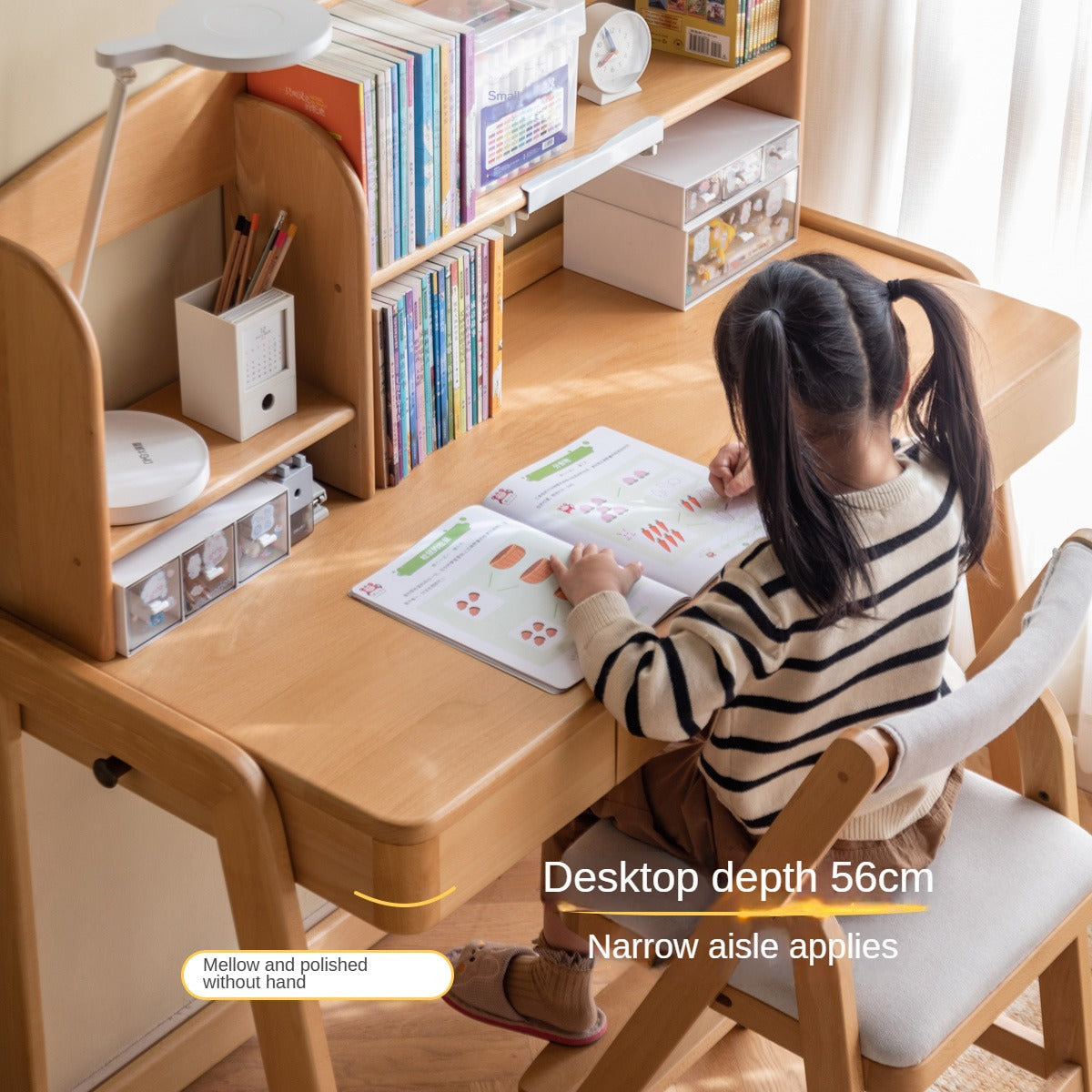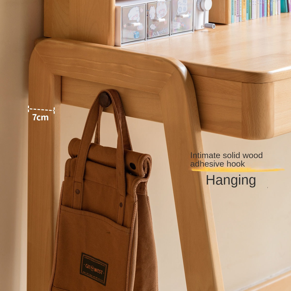 A spacious surface paired with an integrated bookshelf allows ample room for books, supplies, and creative activities. Practical storage is enhanced with a wide drawer featuring a smooth three-section steel ball slide and an adhesive side hook for essentials, keeping the study area organized and clutter-free. The trapezoidal solid wood legs provide a sturdy foundation, ensuring stability even for energetic users in compact home layouts.