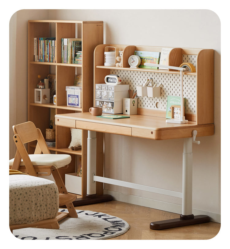 Beautifully crafted with an emphasis on durability and style, the Beech Solid Wood Adjustable Children Study Table with Hand Crank Lift is an outstanding choice for any modern home. Designed to foster productivity, this writing desk features a spacious, smooth beech solid wood surface, providing a stable and reliable space for homework, reading, and creative projects. The natural beech finish is complemented by the sturdy cold-rolled steel leg frame in a sleek beech walnut color, creating an elegant and contemporary look suitable for both bedrooms and study areas.